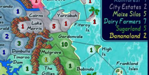 Nothing I can prove, obviously but if you look at the map you'll be able to see that I'm the leading player at the moment. It's only natural that other players would turn against me, but a situation on a boarder of Sugarland and City Estates concerns me. For a few rounds now nothing have changed around there, the same amount of units and no attacks. Which seems strange, given red is at real risk of loosing Yarrabah. But there has been no attacks and no force movements. It seems like the players are convinced no battle will be conducted there - that's why I suspect secret diplomacy.