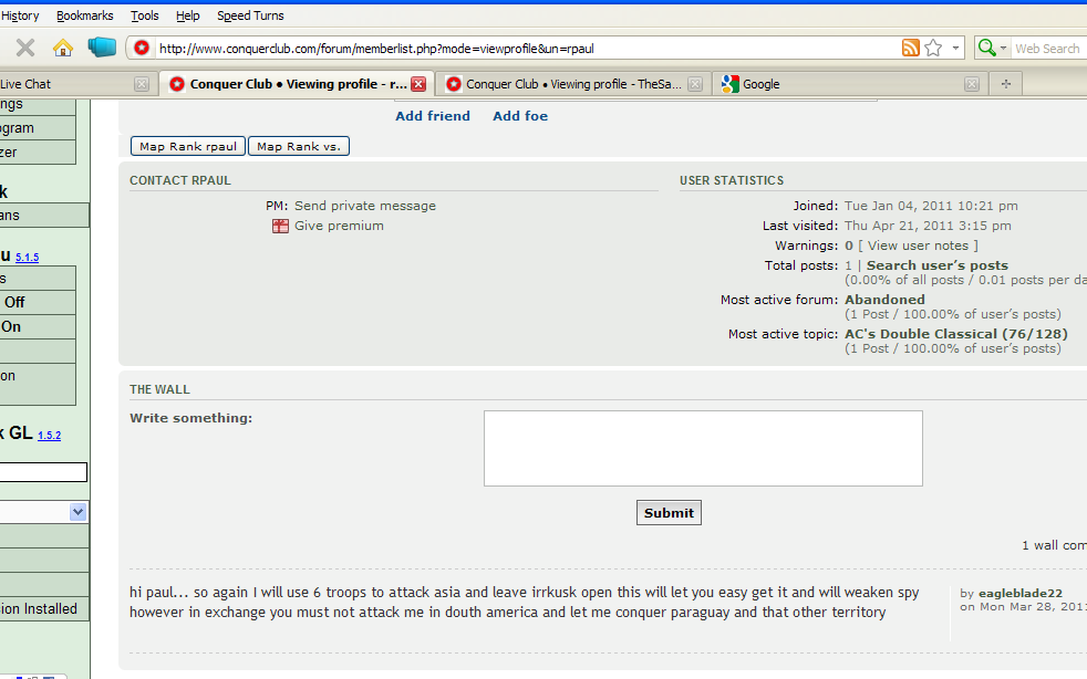 Rpaul was complaining in live chat about bad ratings, I went to have a look and found a message on his wall from eagleblade22 reading- "hi paul... so again I will use 6 troops to attack asia and leave irrkusk open this will let you easy get it and will weaken spy however in exchange you must not attack me in douth america and let me conquer paraguay and that other territory"