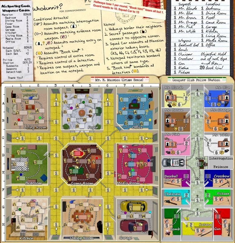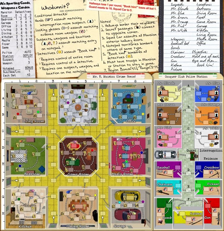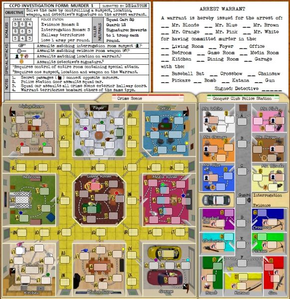Basically, it's "Clue meets Risk". The style is that of the investigating detective's desk. The objective is to "solve the case" by controlling a Suspect, Location and Weapon on the notepad, plus the Warrant for one round. Initial distribution will be only within the "Crime Scene" rooms; all others will be neutrals of various amounts. (1's in the hallways, larger numbers on the important territories).